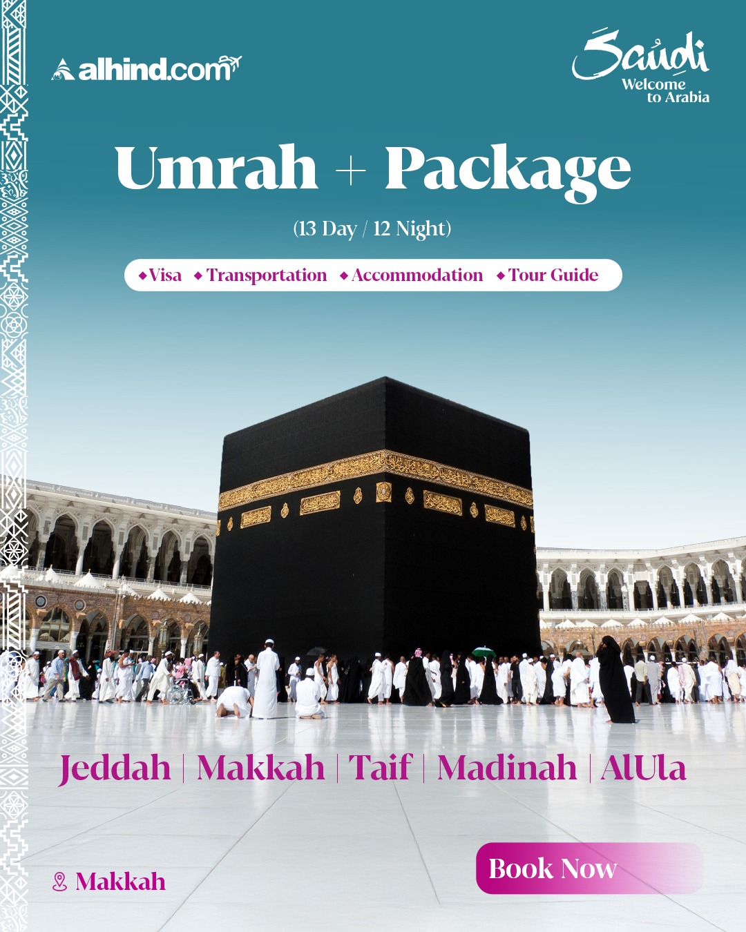 This thoughtfully curated 13-day Umrah & Saudi Arabia journey blends deep spiritual experiences with iconic cultural discoveries across the Kingdom. Begin with sacred Umrah and...
