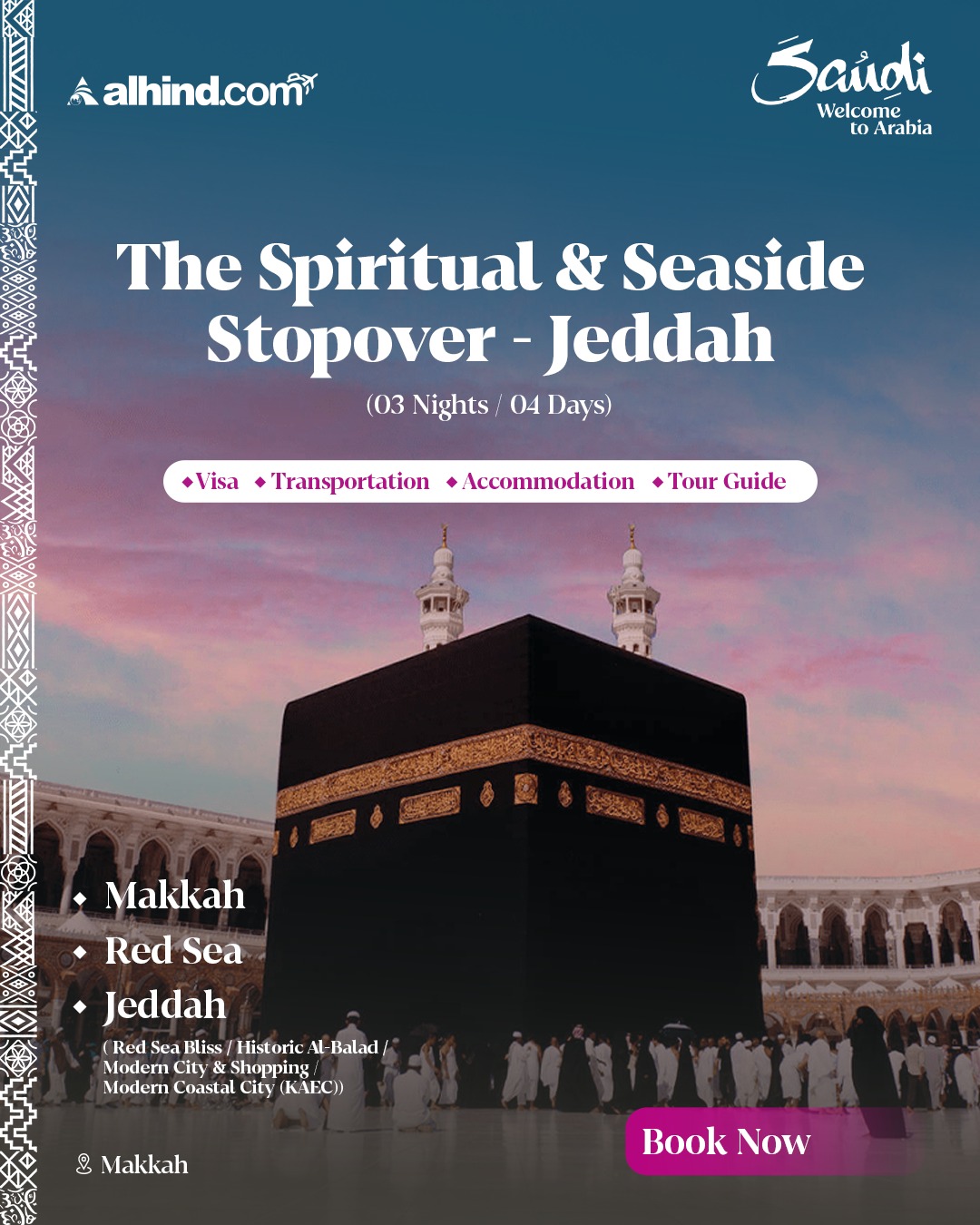 Experience the perfect blend of spirituality, culture, and coastal beauty on this 4-day journey to Saudi Arabia. Begin in the holy city of Makkah, where you will perform Umrah and spend time in prayer and reflection at the revered Masjid al-Haram. Feel the serenity and spiritual connection as you immerse yourself in this sacred city.